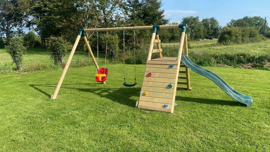 527- 6x6 Wendyhouse wiht Double Slide, Swings and Large Rockwall