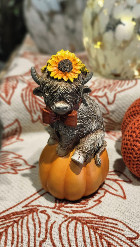 Highland Cow Sitting on Pumpkin with Sunflower
