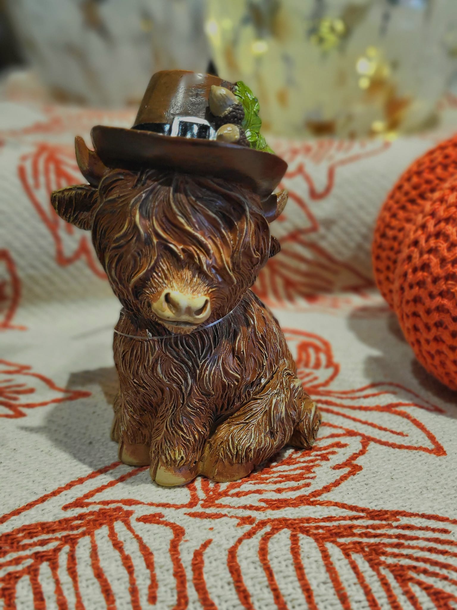 Bring rustic charm and playful character to your décor with this delightful sitting highland cow figurine. The cow is uniquely adorned with a stylish hat, capturing a cosy, countryside vibe. Perfect for shelves, mantelpieces or as a thoughtful gift, these adorable figurines add a touch of warmth and personality to any space. 8.15 x 12cm