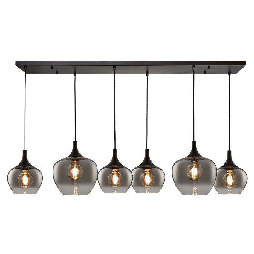The Berkley Glass Pendant Ceiling Light features six globes with a black smoked glass finish. It measures 32 cm in height and 120 cm in length. Designed to accommodate six 40W E27 bulbs, which are sold separately.