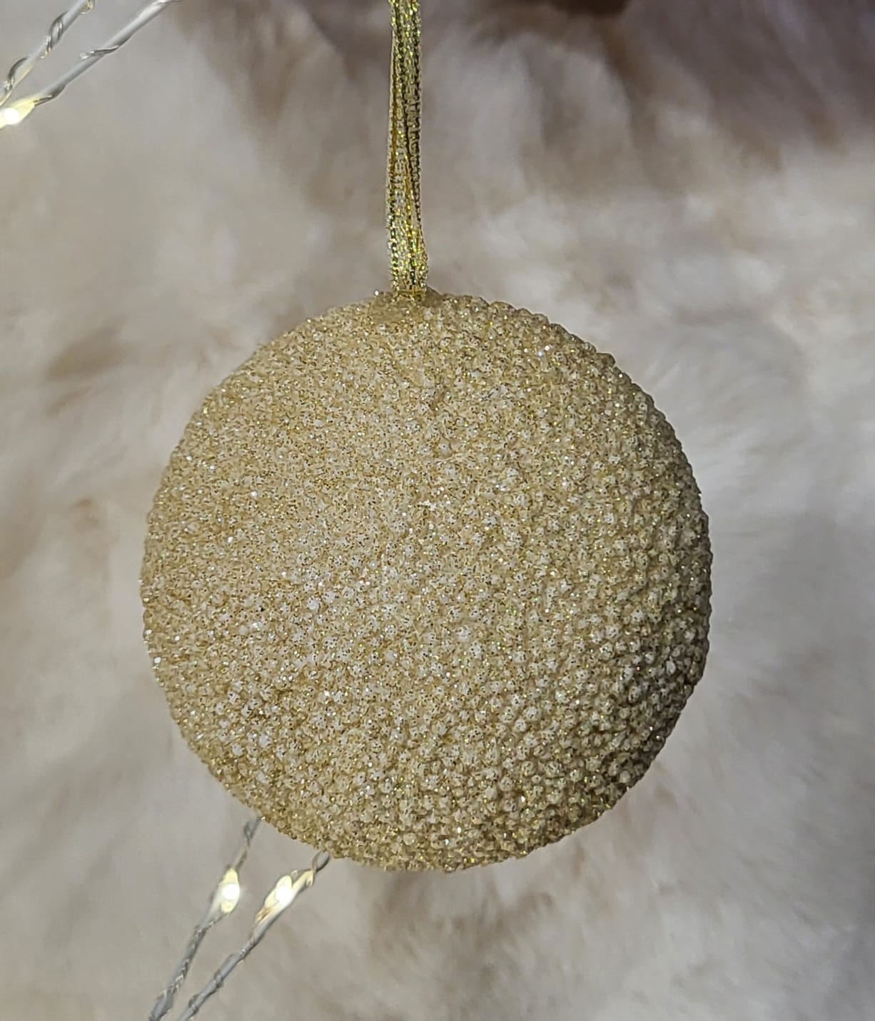 8cm soft gold glitter bauble on gold ribbon