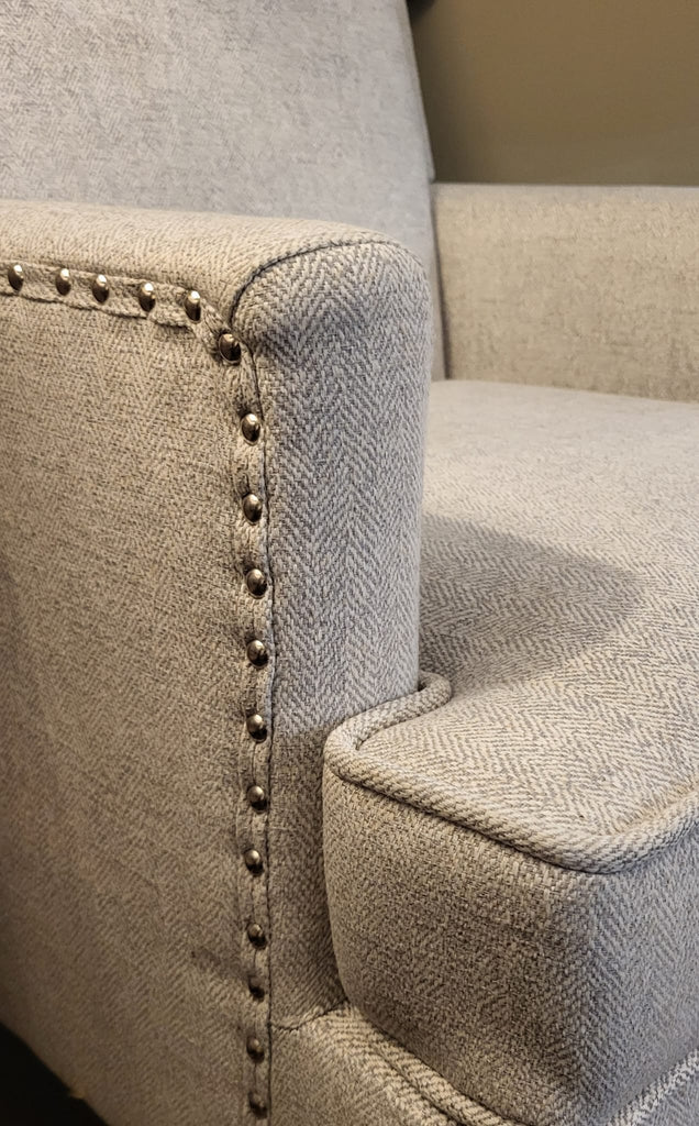 The UH70 chair has stud features along the outside arm and across the front base giving it a timeless style. Covered in a soft grey linen herringbone fabric makes it practical and easy to keep clean.