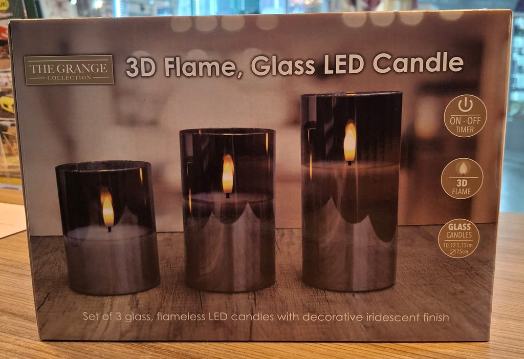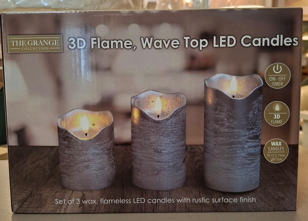 3D Flame, Wave Top LED Candle Set of 3 Silver