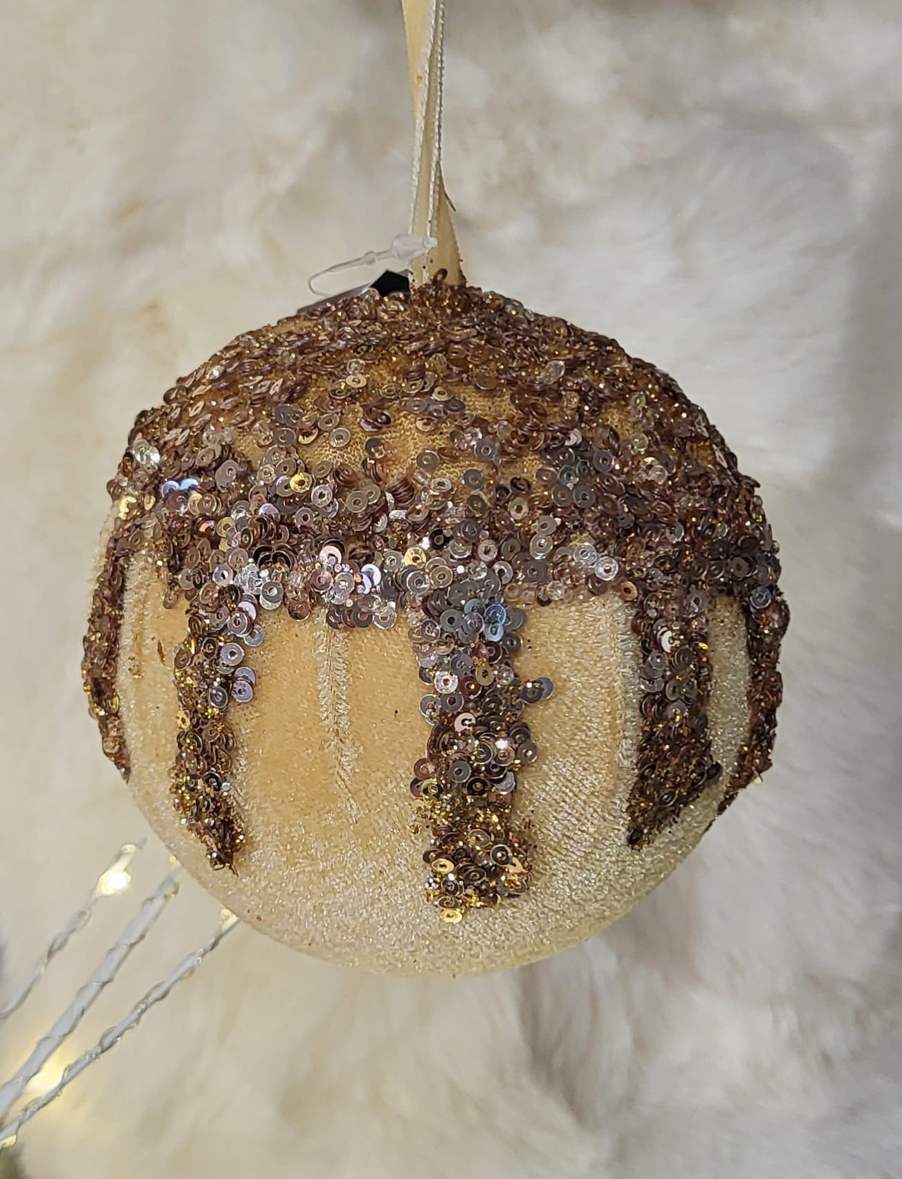 10cm round Velvet covered bauble in Dark Champagne with a glitter top dressing and velvet ribbon to hang on tree