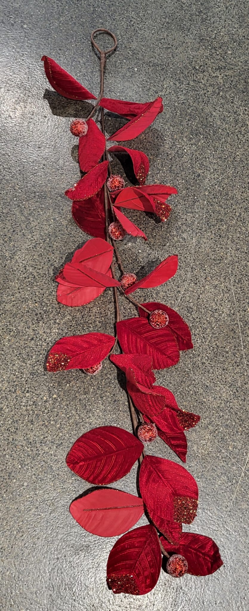 118cm Red Garland with velvet leaves and glitter feature