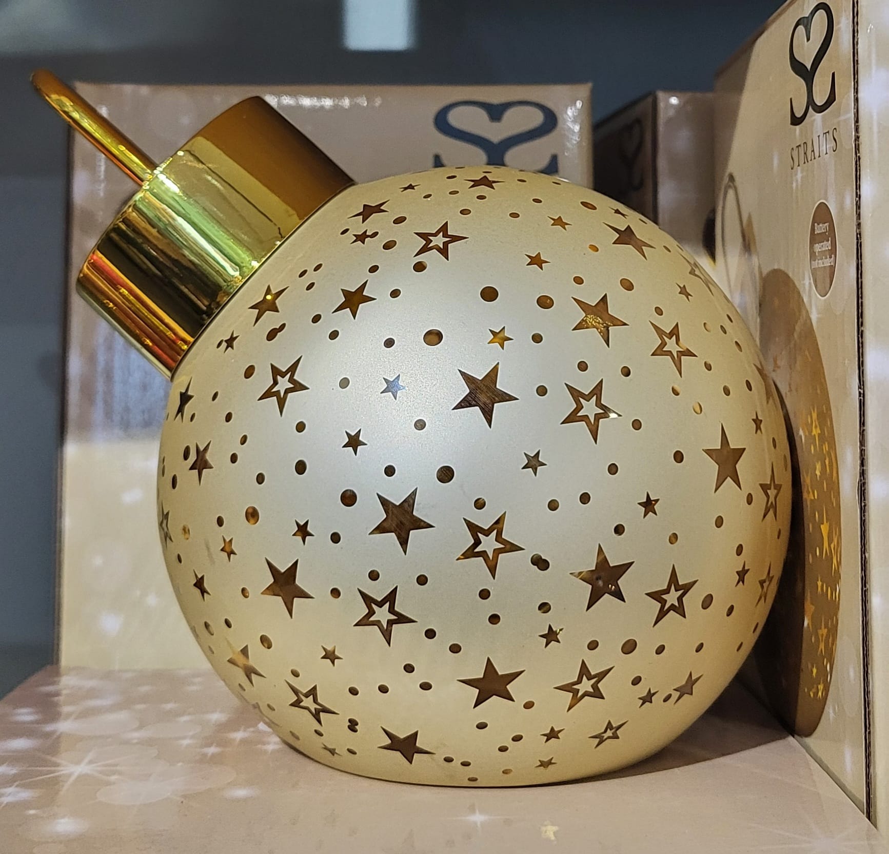 Designed to sit on a shelf or table - this gold glass bauble contains LED lights casting a subtle pattern when lit.