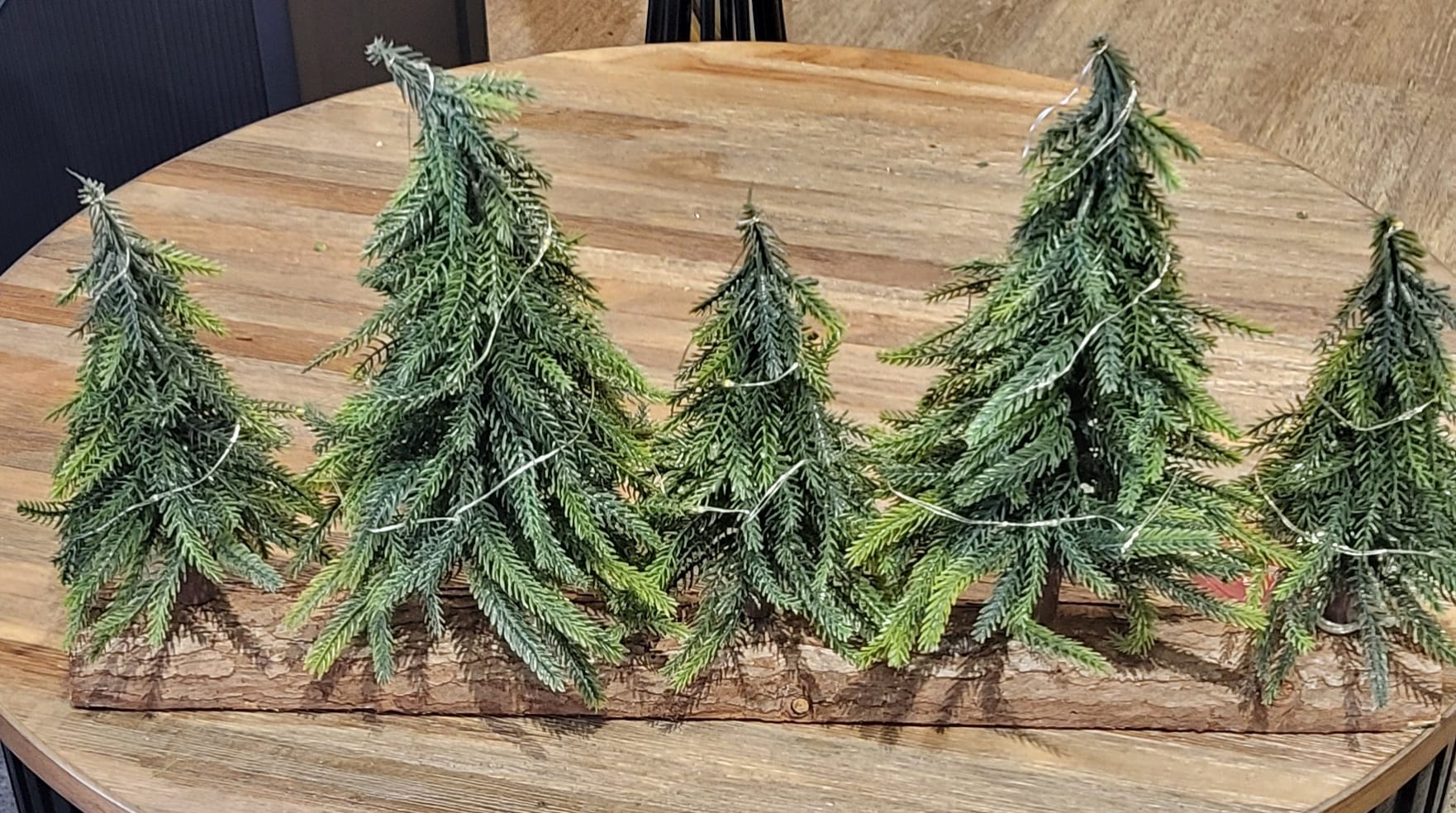 Set of 5 artificial Christmas Trees with LED lights (on timer) set on a long log.
