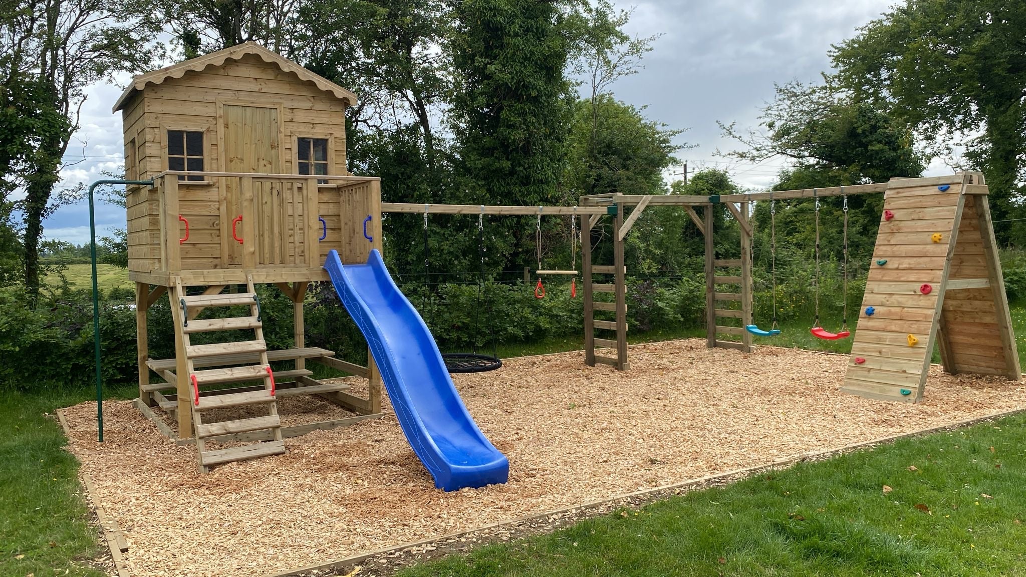 603-6x6 Wendyhouse, Monkey Bars and Full Rock-Wall