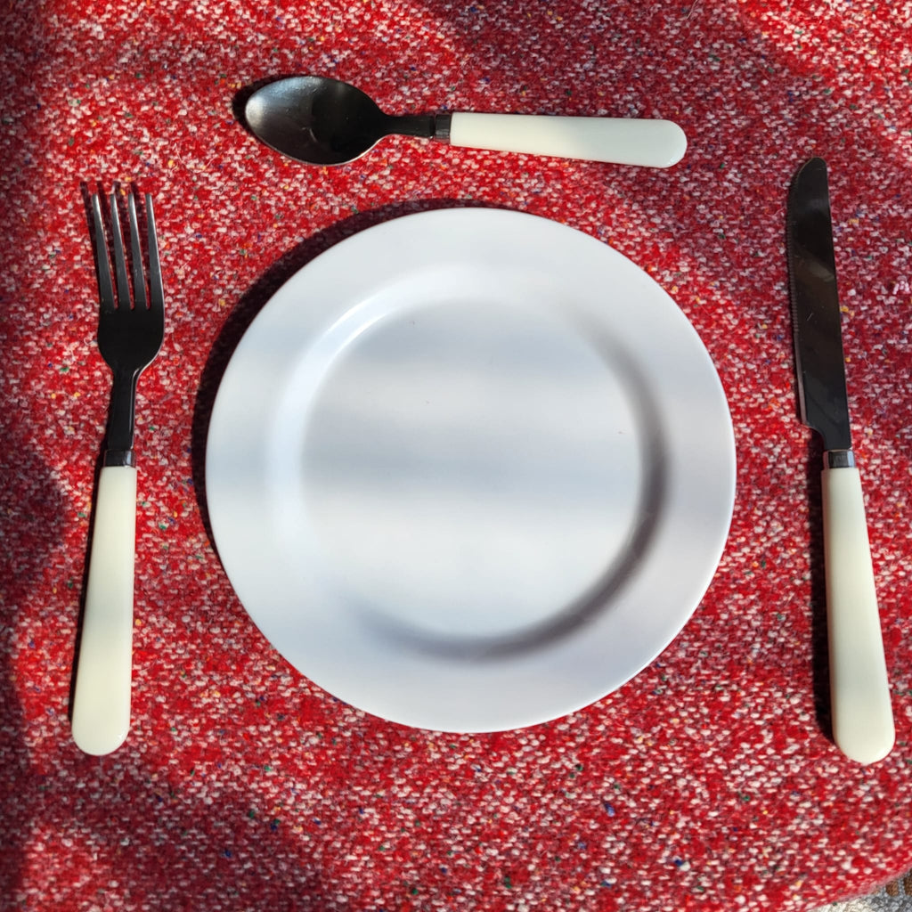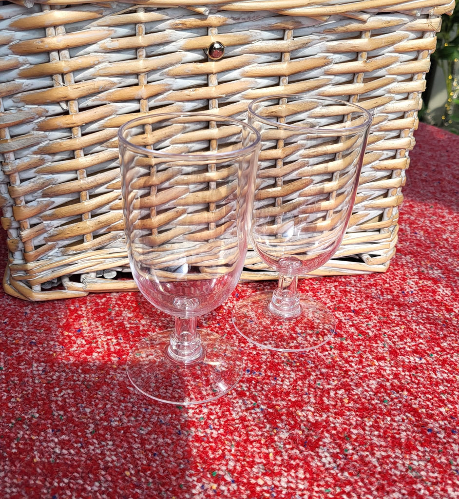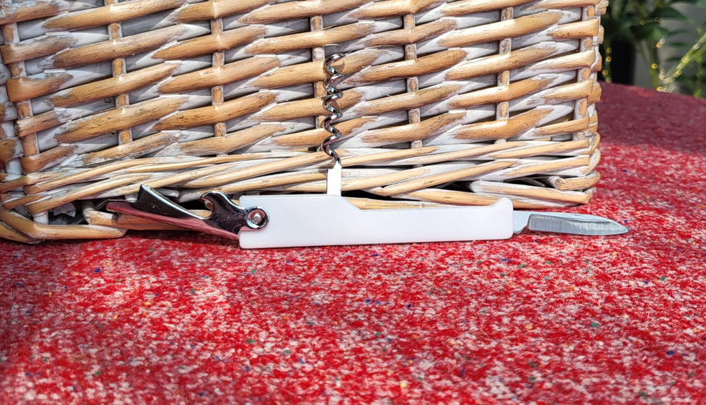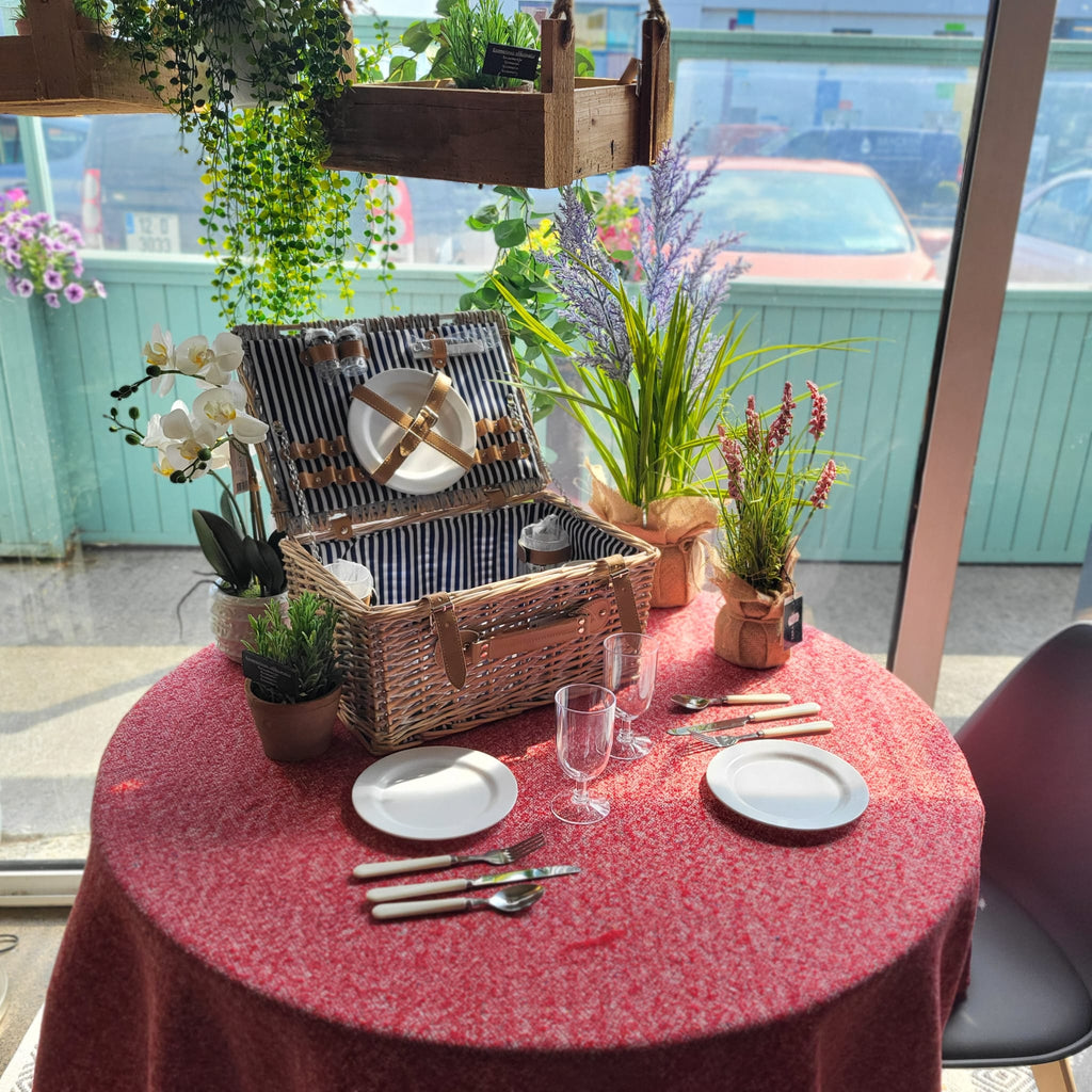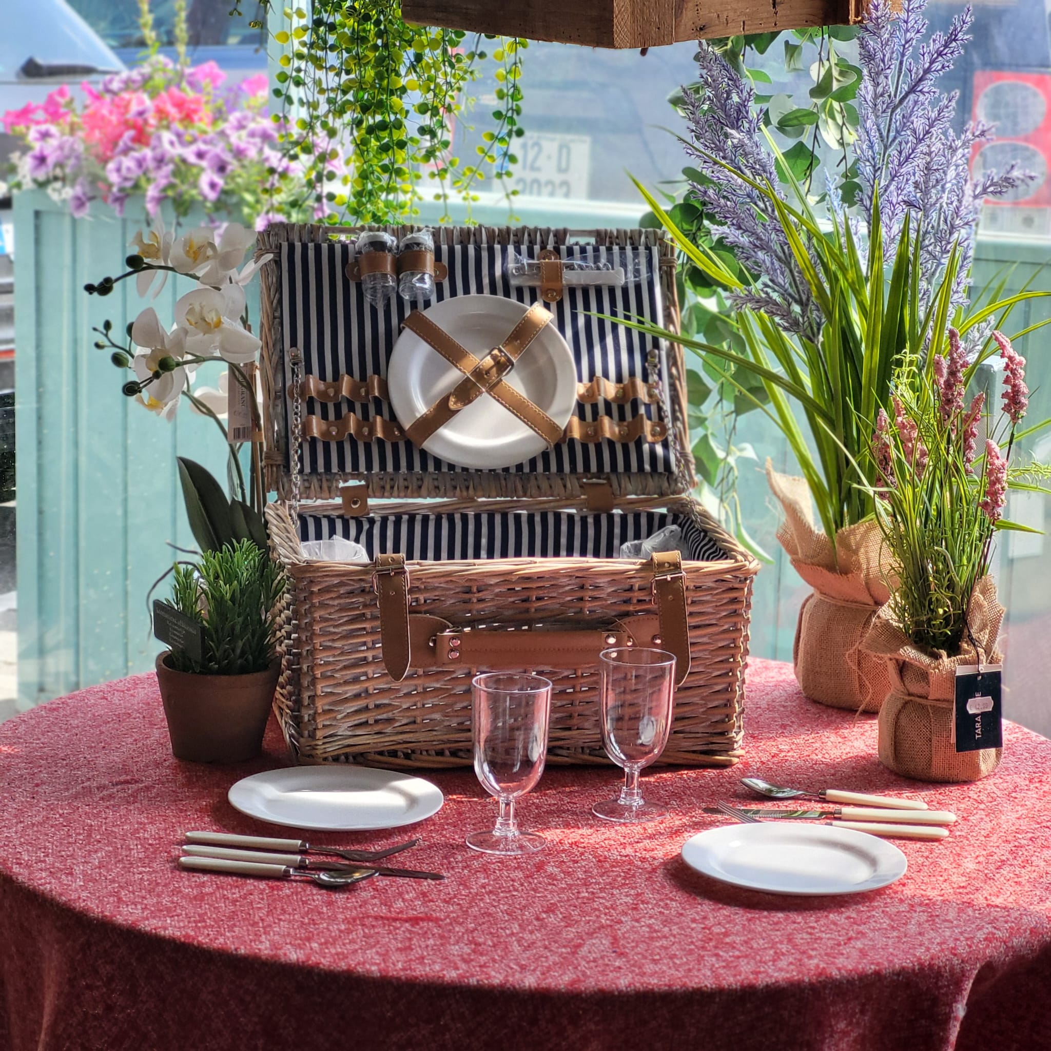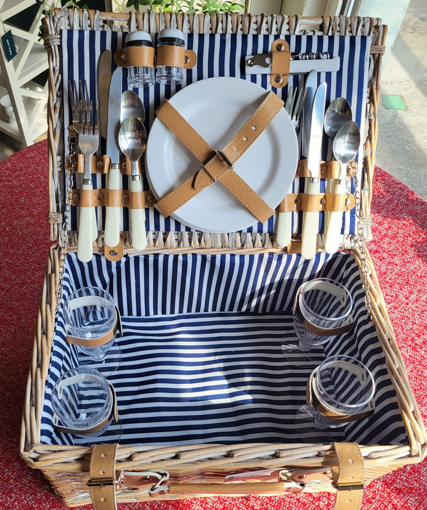 Wicker picnic basket with blue and white lining, this set contains plates, cutlery, and glasses for four people, as well as salt and pepper shakers and a bottle opener multi-tool. The basket has slots for all of its inclusions and extra room for your own items.